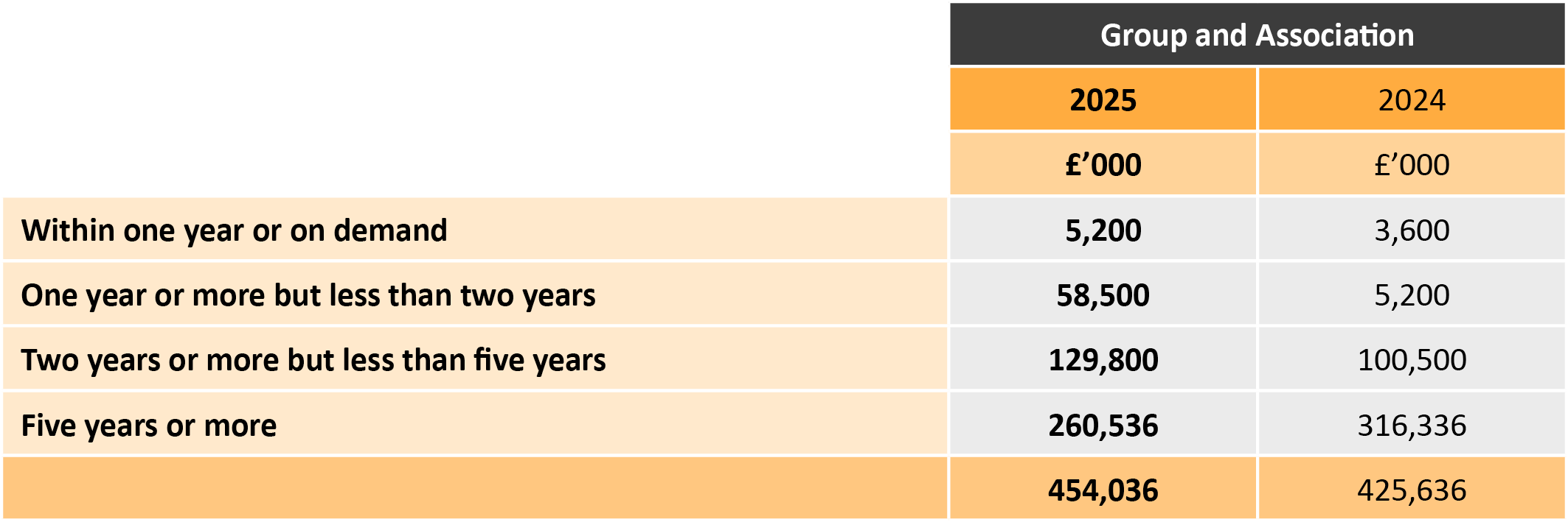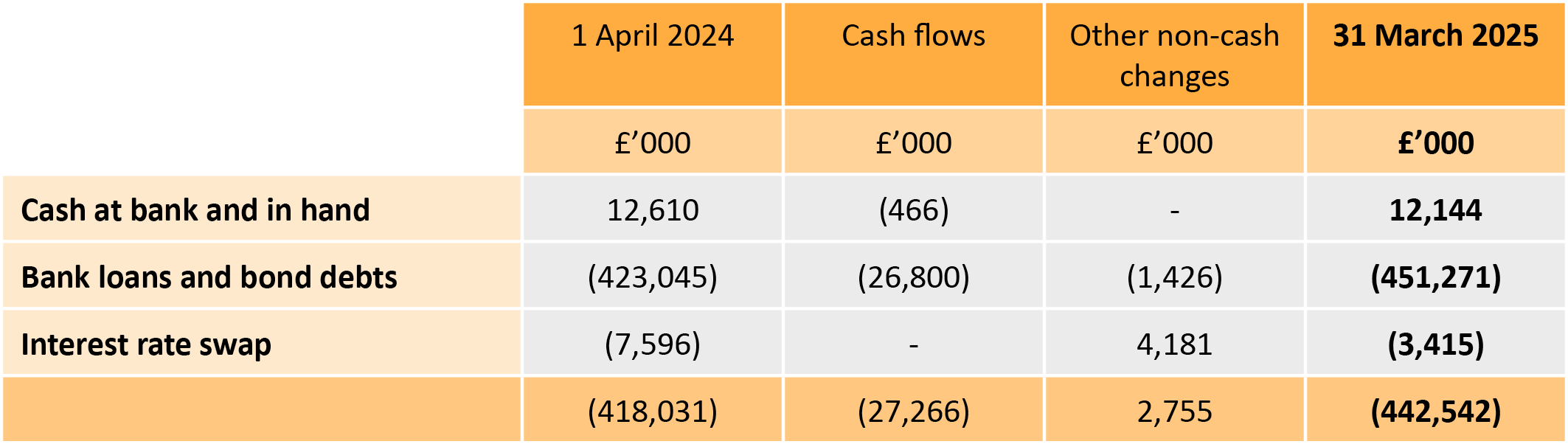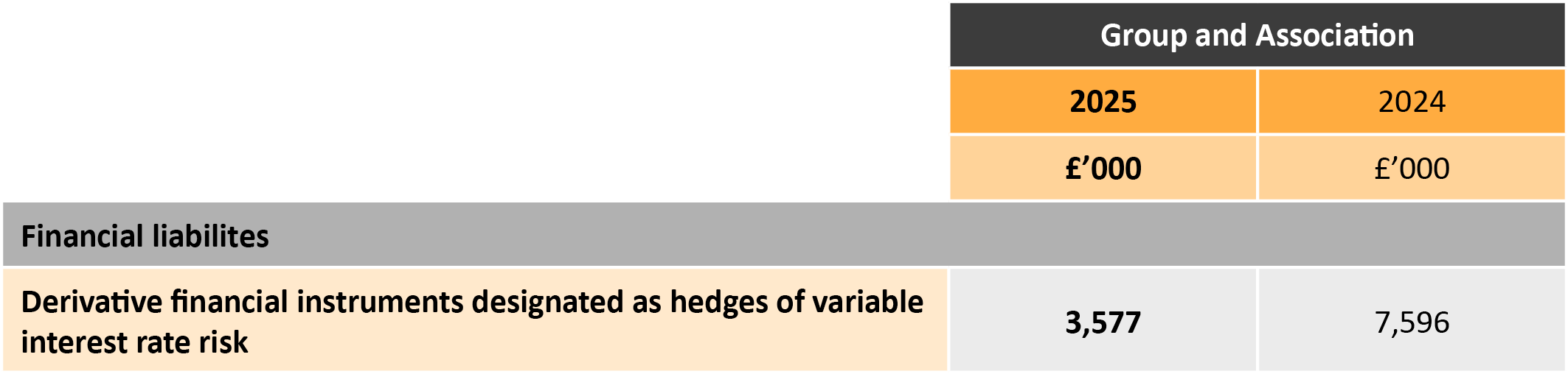 The derivatives are accounted for as a hedge of variable rate interest rate risks, in accordance with FRS 102 and had a fair value of £3.6m (2024: £7.6m) at the balance sheet date. The cash flows arising from the interest rate swaps will continue until their maturity. The change in fair value in the period was £4.0m; £0.6m charge as movement in fair value of financial instruments in the statement of comprehensive income and £3.6m the financial instrument hedging reserves.