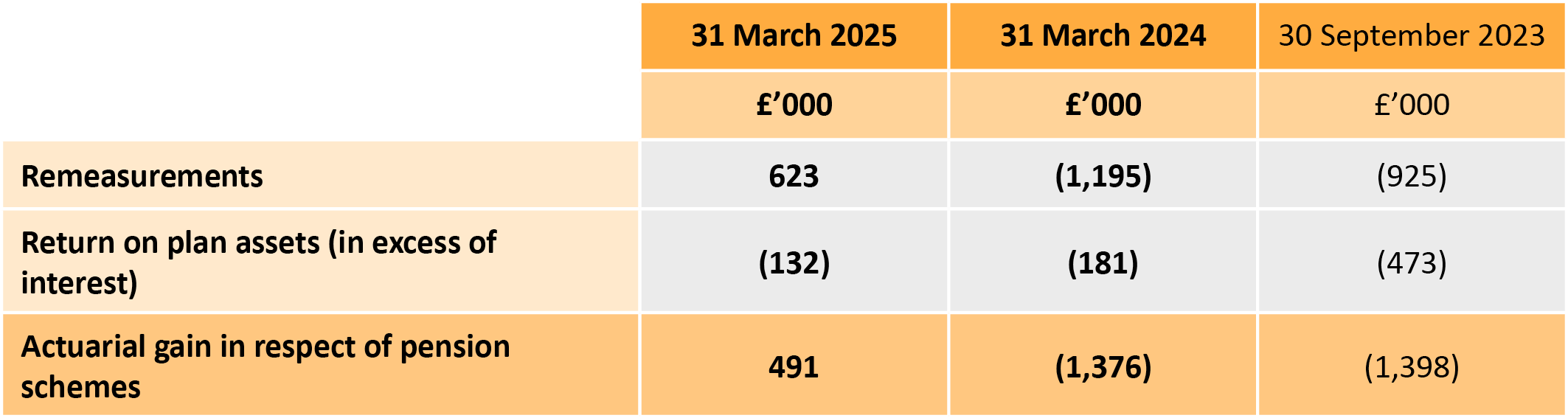 While the calculations above would leave Settle in a surplus position of £2.369m (2024: £1.822m), LGPS cannot demonstrate that the Association could take advantage of the asset position in reduced payments or take ownership upon death of the final living scheme member. As a direct result, Settle cannot recognise the surplus as LGPS does not form a debtor to the Association. The pensions liability is therefore capped at nil, leaving a total movement in reserves of £0.056m (2024: £2.55m), comprised of the recognisable portion of the remeasurements.
